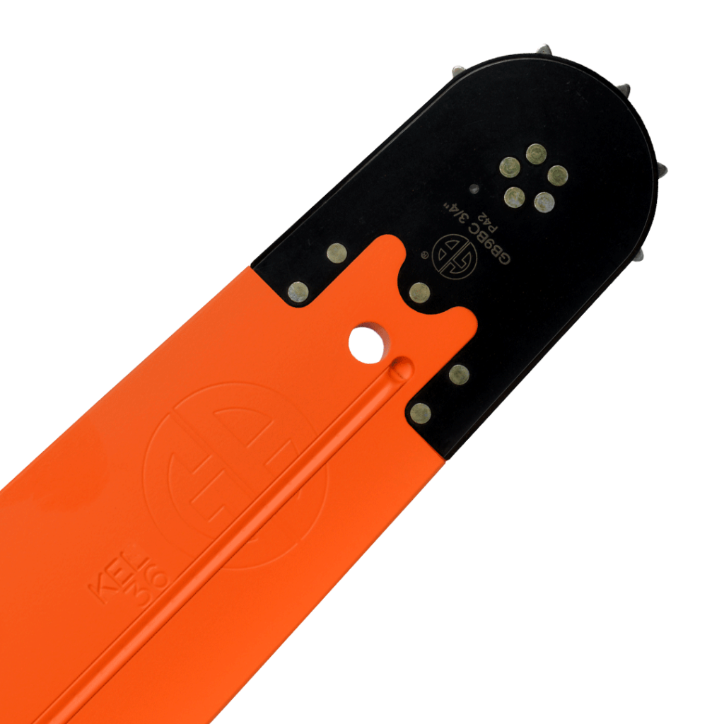 It has a large replaceable 9-tooth sprocket with a machined edge that matches the width of the chain, this reduces wear and extends the life of the nose. The precision roller bearings are lubricated by Lube Direct™ patented technology. Lube Direct™ provides consistent lubrication to the roller bearings, extending the life of the guide bar and reducing the risk of the nose spreading.