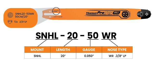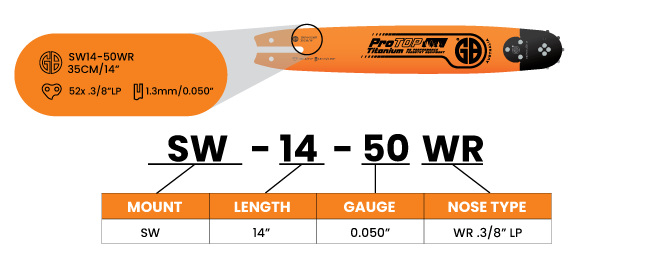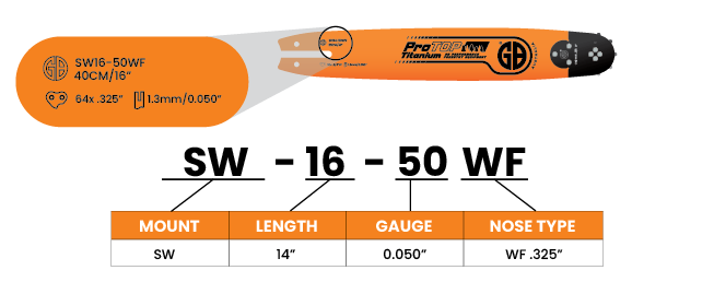 | NOSE: | REPLACEABLE 9 Tooth Sprocket Nose .3/8"LP (GB9WTR) REPLACEABLE 10 Tooth Sprocket Nose .325" (GB10WTF) |